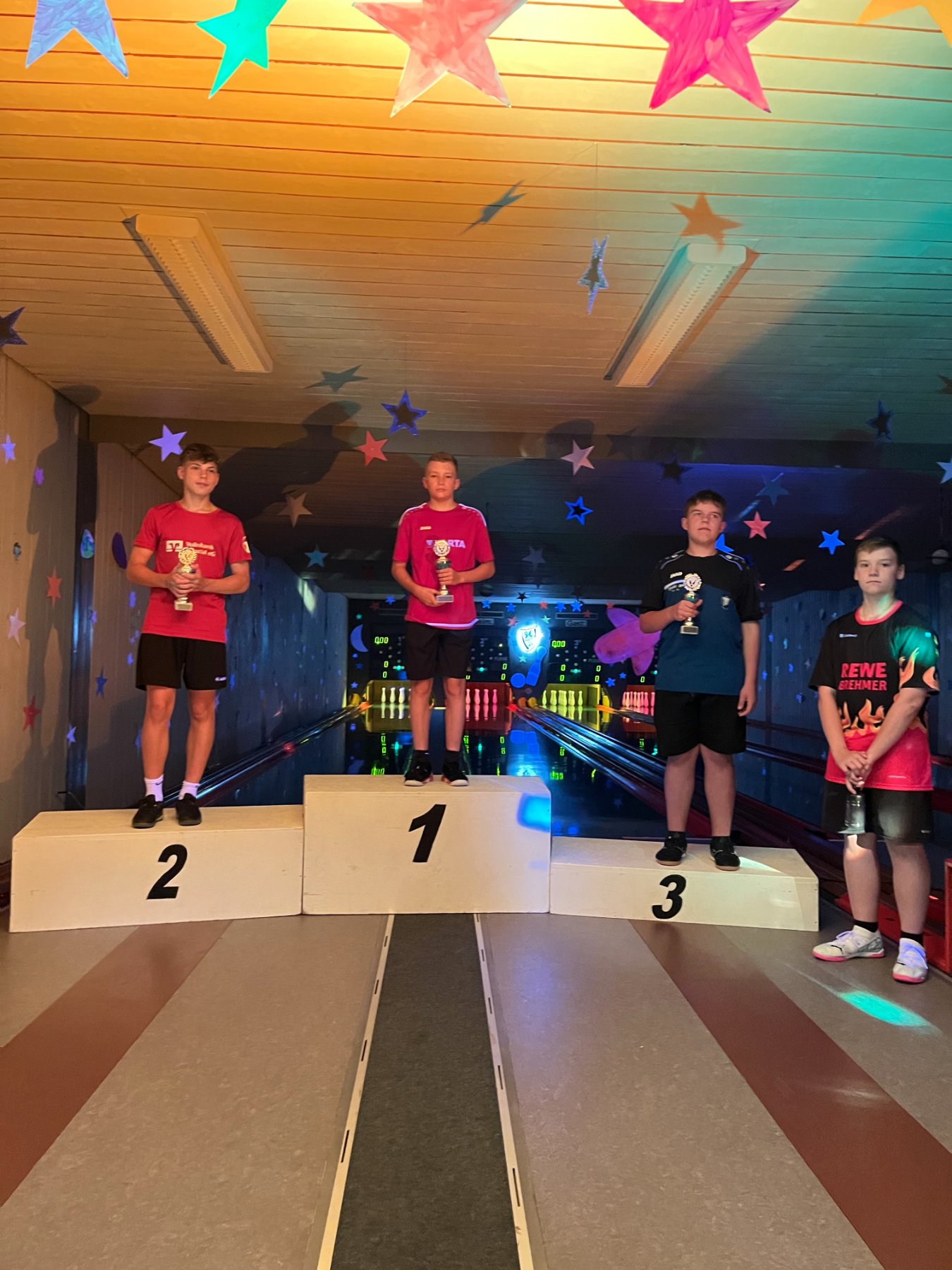 Die Jungs lieferten sich ebenfalls sowohl im Vorlauf als auch im Finale einen engen und harten Kampf. Mit einem Kegel mehr setzte sich Jakob Gans (Lonsee) im Vorlauf auf den ersten Platz vor Lasse Diehl aus Essingen. Mit nur zwei Kegeln weniger sicherte sich Richard Keller (Hermaringen) ebenfalls eine zweite Chance im Finale. Den letzten Platz für das Finale erkegelte sich Leopold Grünwald (Hermaringen). Im Kampf um die Podestplätze zählte jeder Fehler und Unachtsamkeit. Mit den geringsten Fehlwurf musste sich Lasse Diehl am Ende mit dem vierten Platz zufrieden geben. Ein Kegel weniger auf den zweiten Platz, welchen Jakob Gans belegte, bescherte Leopold Grünwald den dritten Platz. Den Sieg in der U10-männlich feierte am Ende Richard Keller.