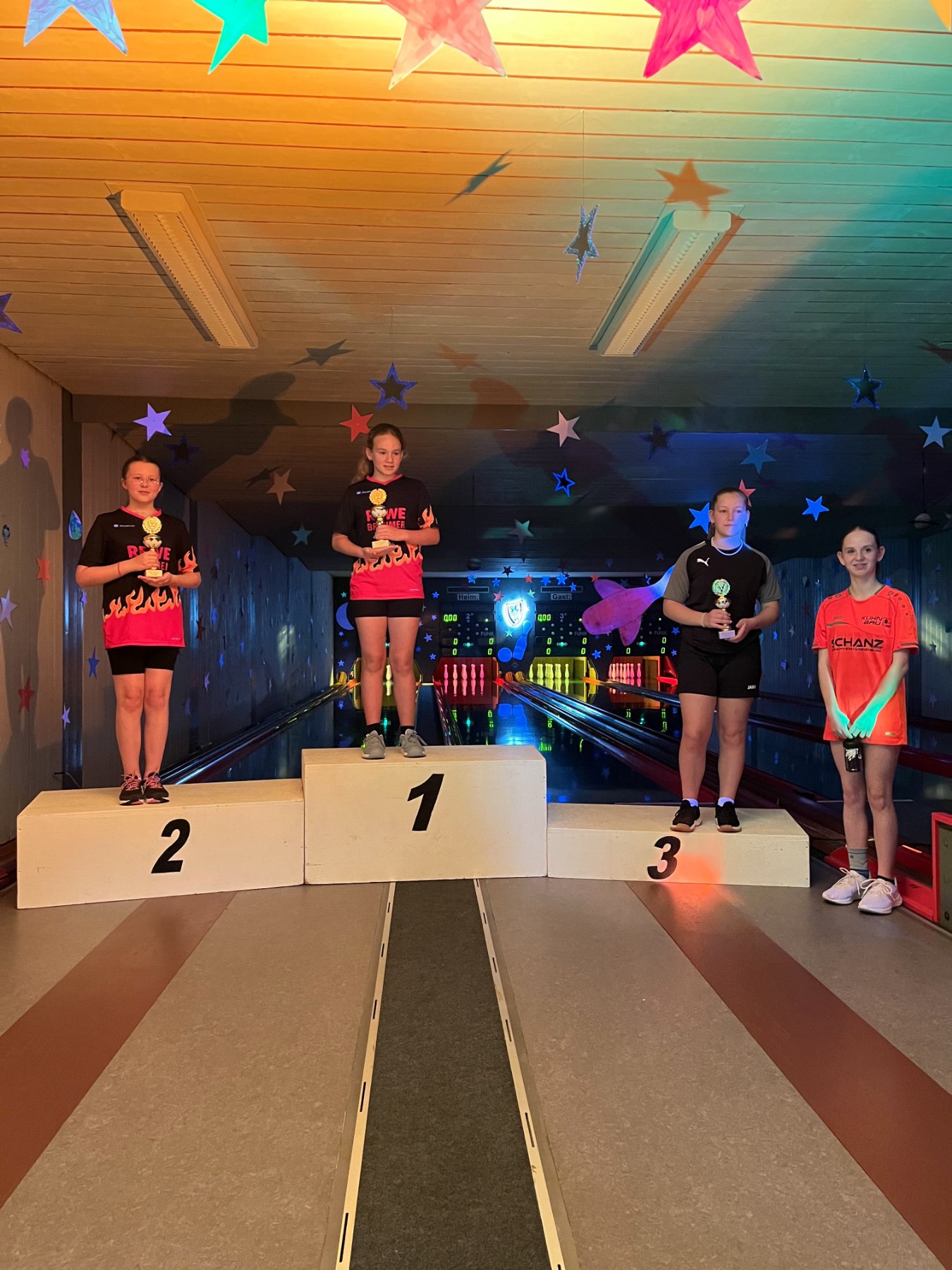 Bei den Mädels verlief der Kampf um den Galaxy-Pokal mehr als spannend. Im Halbfinale sicherten sich Sophia Schmidt und Victoria Rupp den Einzug ins Finale. Dadurch entstanden im Finale zwei interne Vereinsduelle. Um Platz 3 kämpften die Schwabsbergerinnen Pia Meier und Maja Weber, wobei Pia mit zwei Satzpunkten den Sprung aufs Podest schaffte. Die Mädels aus Essingen, Sophia Schmidt und Victoria Rupp mussten nach einem Unentschieden die Entscheidung im Sudden Victory fällen. Aber auch hier stand es nach drei Wurf 16 Kegel zu 16 Kegel. Die Bahnen wurden gewechselt und erneut mussten drei Wurf in das Volle die Entscheidung herbei führen. Mit ganz knappen 17 Kegel zu 16 Kegel konnte sich Sophia Schmidt das dritte Mal in Folge den Titel sichern. Wir gratulieren zu diesem großartigen Erfolg.