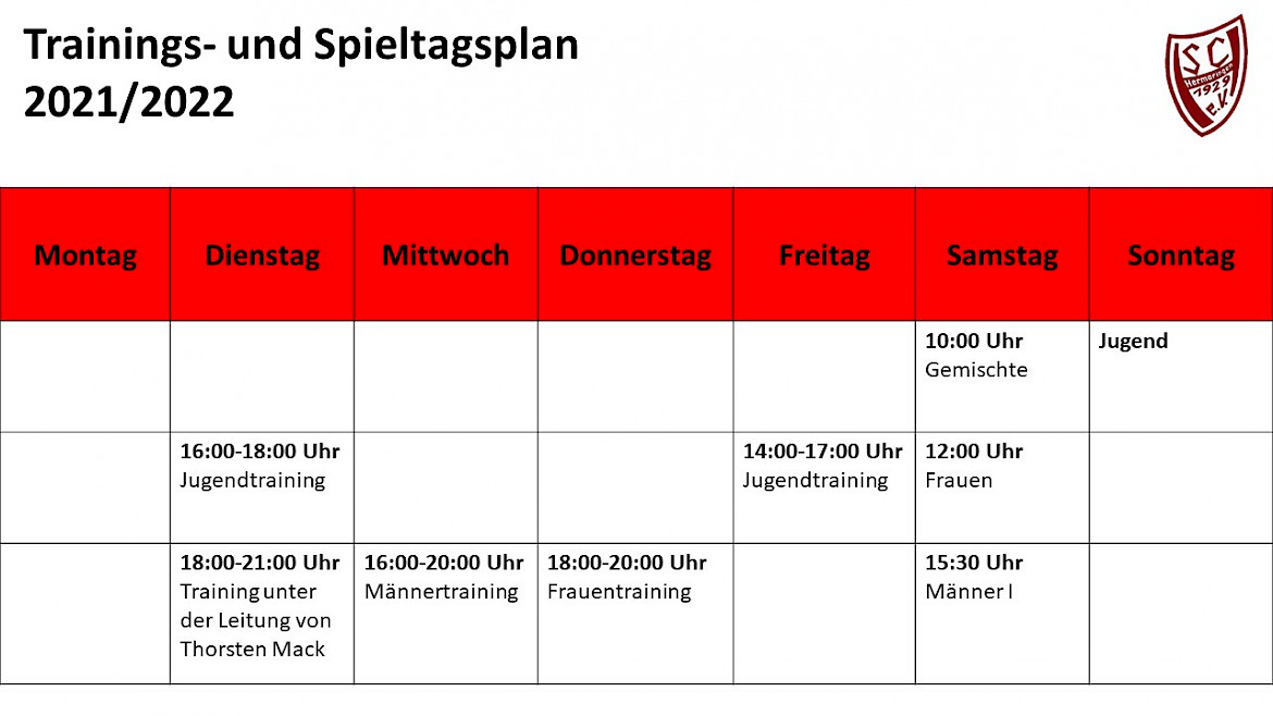 Das Training ist wie in folgender Tabelle dargestellt organisiert. Des Weiteren finden sich dort auch die gleichbleibenden Uhrzeiten für die Heimspieltage. Die detaillieerte Bahnenbelegung wird durch unsere vereinseigene App organisiert. Zugangsdaten zur Trainingsanmeldung können beim stellvertretenden Abteilungsleiter Matthias Eck angefragt werden.